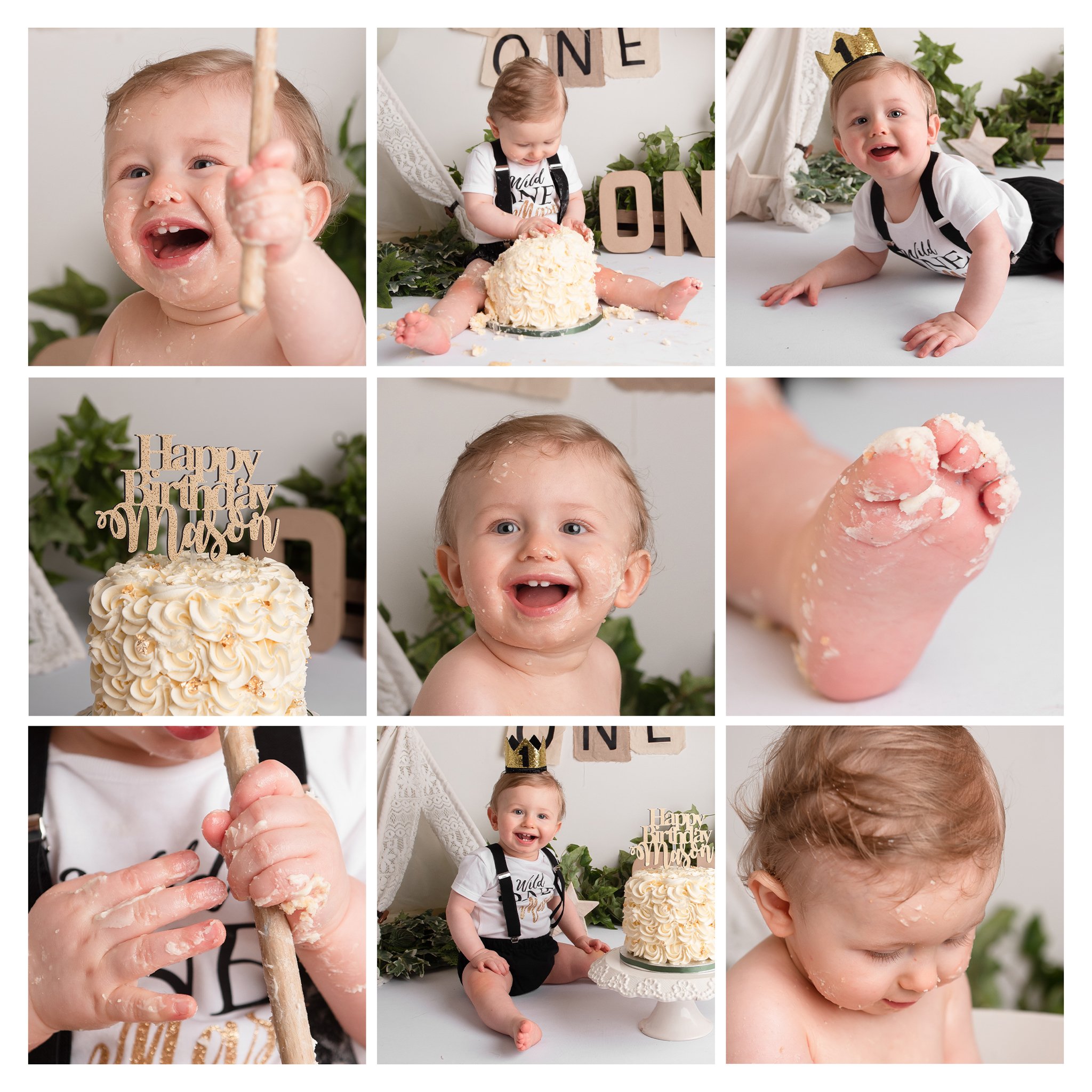 The shoot lasts between 45-90 minutes, we begin with a few pictures of your little one in a casual outfit and optional family photos, then we add the decorations, the cake smash outfit and the cake, and let the fun begin! If your little one is happy to carry on after we can turn it into a smash and splash and do some bath time shots at the end.